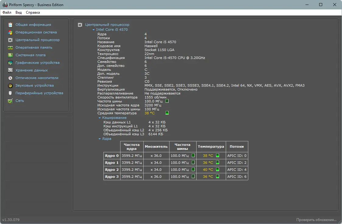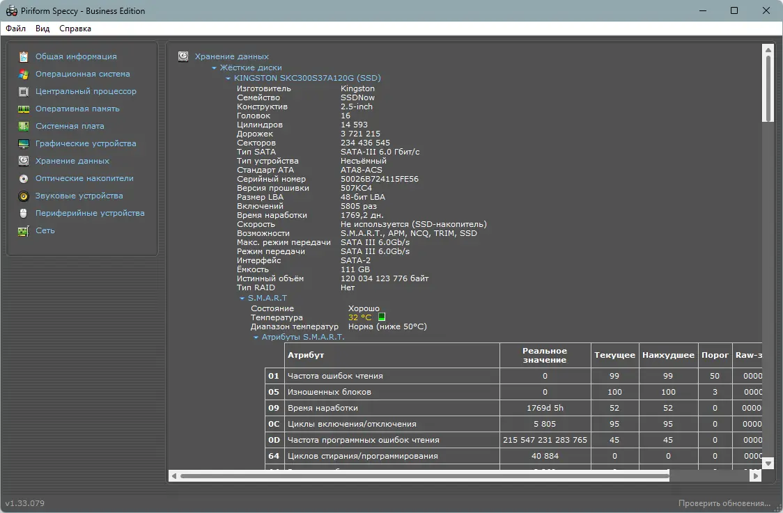 Speccy отличается высокой точностью сбора данных и минимальным потреблением системных ресурсов. Программа работает стабильно на различных версиях Windows и поддерживает как 32-, так и 64-битные системы. Интерфейс прост и логичен, а информация структурирована по категориям, что упрощает навигацию. Тем не менее, бесплатная версия имеет ограниченный функционал по сравнению с платными редакциями, такими как Professional и Technician Edition.