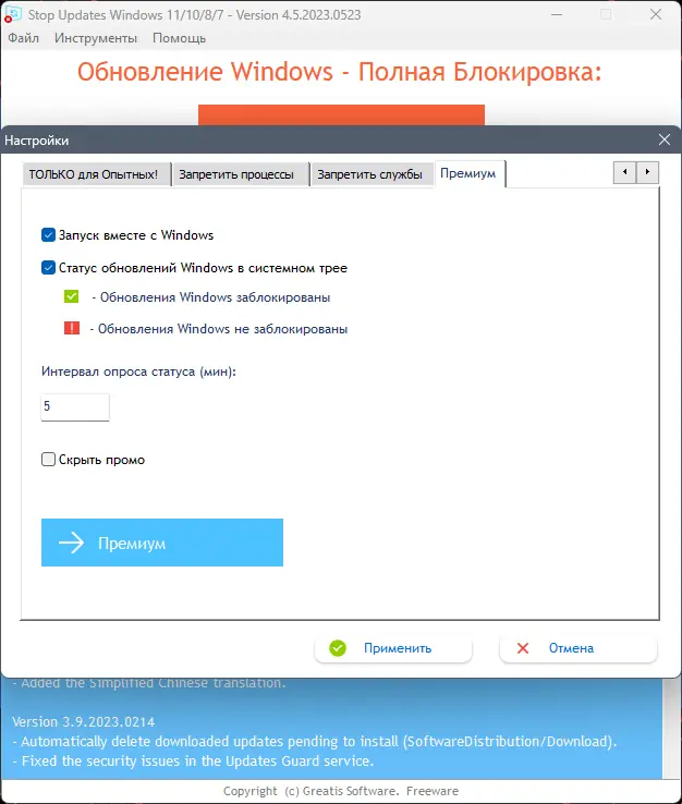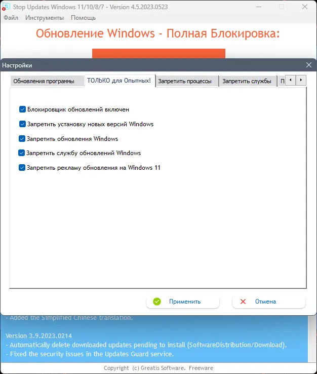 - Останавливает принудительные обновления, инициируемые операционной системой.
