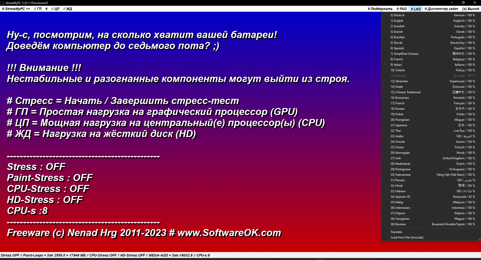 StressMyPC — это компактная утилита для стресс-тестирования компонентов компьютера, позволяющая оценить производительность системы под высокой нагрузкой и проверить стабильность оборудования. Программа подходит как для обычных пользователей, так и для энтузиастов, разогнавших процессор или видеокарту. С её помощью можно протестировать центральный процессор, графическое ядро и накопители в экстремальных режимах.