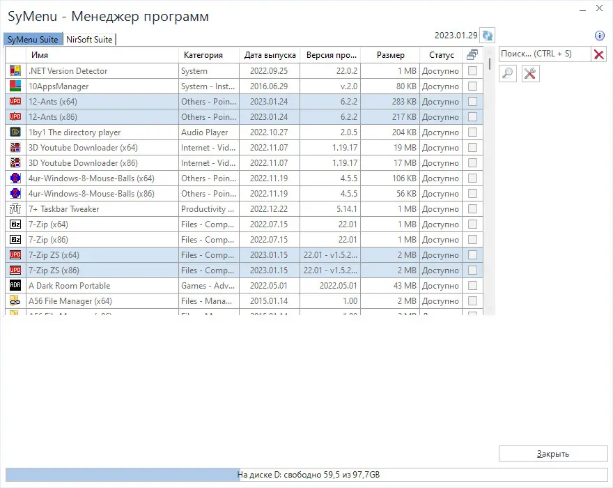 Работа с программой начинается с запуска файла SyMenu.exe, после чего открывается основное меню, доступное через иконку в системном трее или на рабочем столе. Добавление новых элементов осуществляется через контекстное меню или функцию перетаскивания, что ускоряет процесс настройки. Пользователь может добавлять ссылки на исполняемые файлы, папки, документы, URL-адреса и команды Windows. Для массового импорта предусмотрена функция пакетного добавления, позволяющая загрузить сразу несколько элементов по списку путей. Менеджер приложений даёт возможность выбирать и скачивать утилиты из коллекций SyMenu suite, NirSoft suite и Sysinternals suite прямо из интерфейса. Также доступен режим автозапуска, позволяющий настроить запуск определённых программ при старте или закрытии SyMenu.