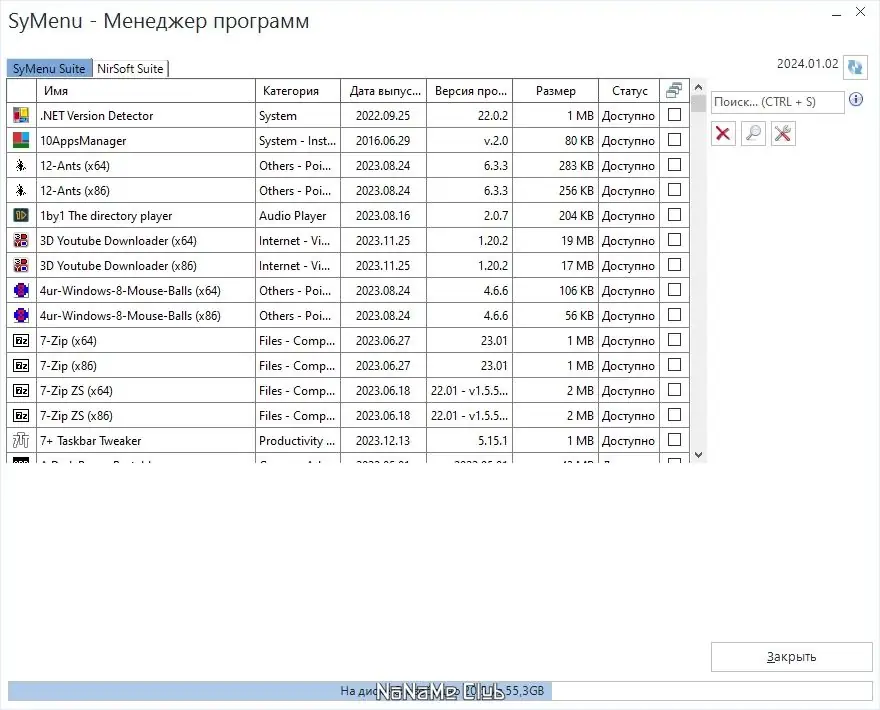 - Встроенный менеджер приложений даёт доступ к обширным коллекциям утилит, включая SyMenu suite, NirSoft suite и Sysinternals suite.