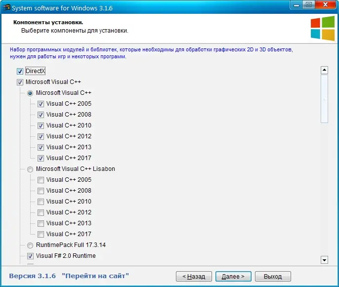 System software for Windows — это универсальный установщик, объединяющий множество необходимых компонентов для полноценной работы приложений и игр на операционной системе Windows. Утилита автоматически определяет разрядность системы и предлагает только совместимые пакеты, упрощая настройку компьютера после чистовой установки ОС. Программа экономит время, избавляя от ручного поиска и установки библиотек, от которых зависят современные и устаревшие приложения.