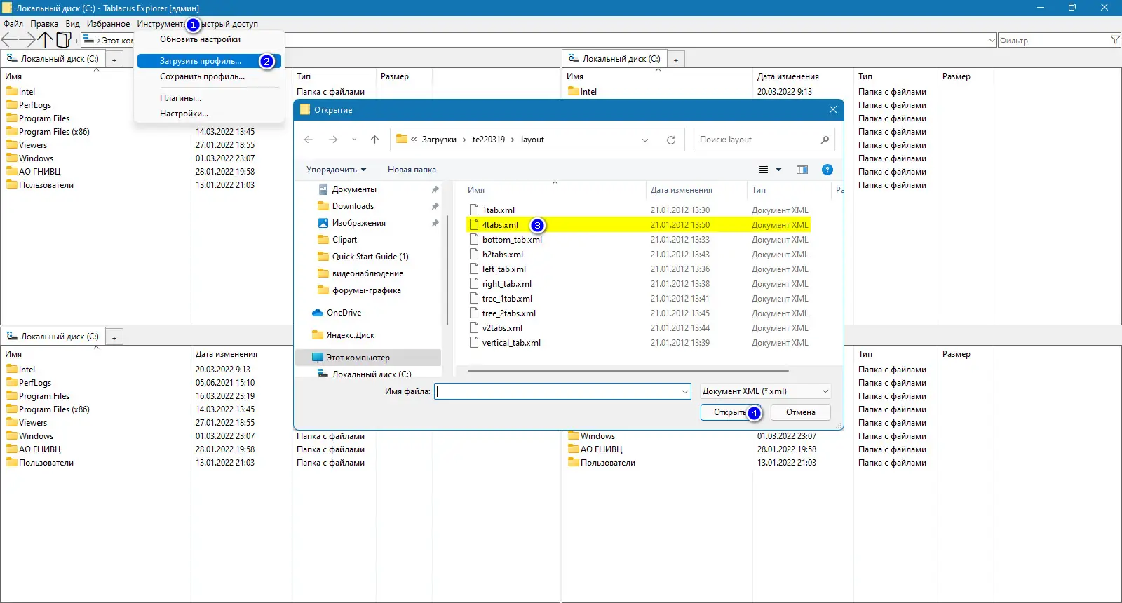 Tablacus Explorer разработан как альтернатива стандартному проводнику Windows, сочетающая простоту интерфейса с расширенным функционалом. Программа поддерживает двух- и четырёхпанельный режимы, а также работу с множеством вкладок, что упрощает навигацию между каталогами. Пользователь может быстро переключаться между папками, перетаскивать их на панель вкладок или открывать через контекстное меню. Интерфейс остаётся интуитивно понятным, что особенно важно для тех, кто не хочет переучиваться на сложные двухпанельные оболочки.