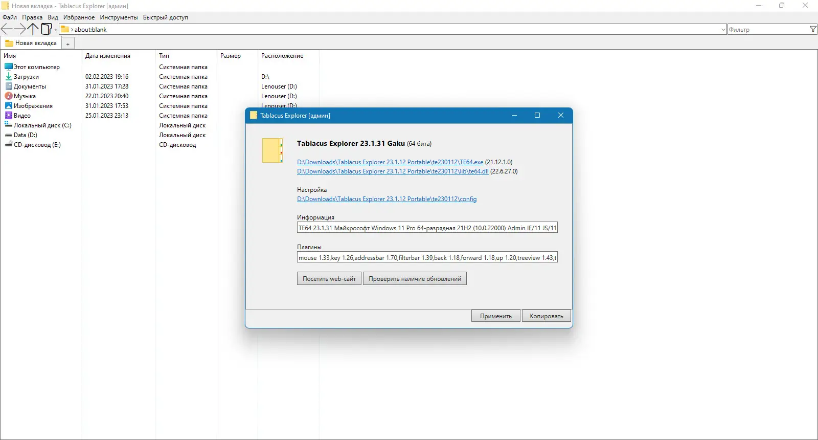 Использование Tablacus Explorer интуитивно понятно благодаря схожести с классическим проводником Windows. Для создания новой вкладки достаточно перетащить папку на панель вкладок или воспользоваться контекстным меню. Переключение между панелями осуществляется с помощью горячих клавиш или мыши, а управление файлами выполняется стандартными операциями — копирование, перемещение, удаление, переименование. Дополнительные функции активируются через меню «Инструменты», где доступен центр управления плагинами и настройка профилей.