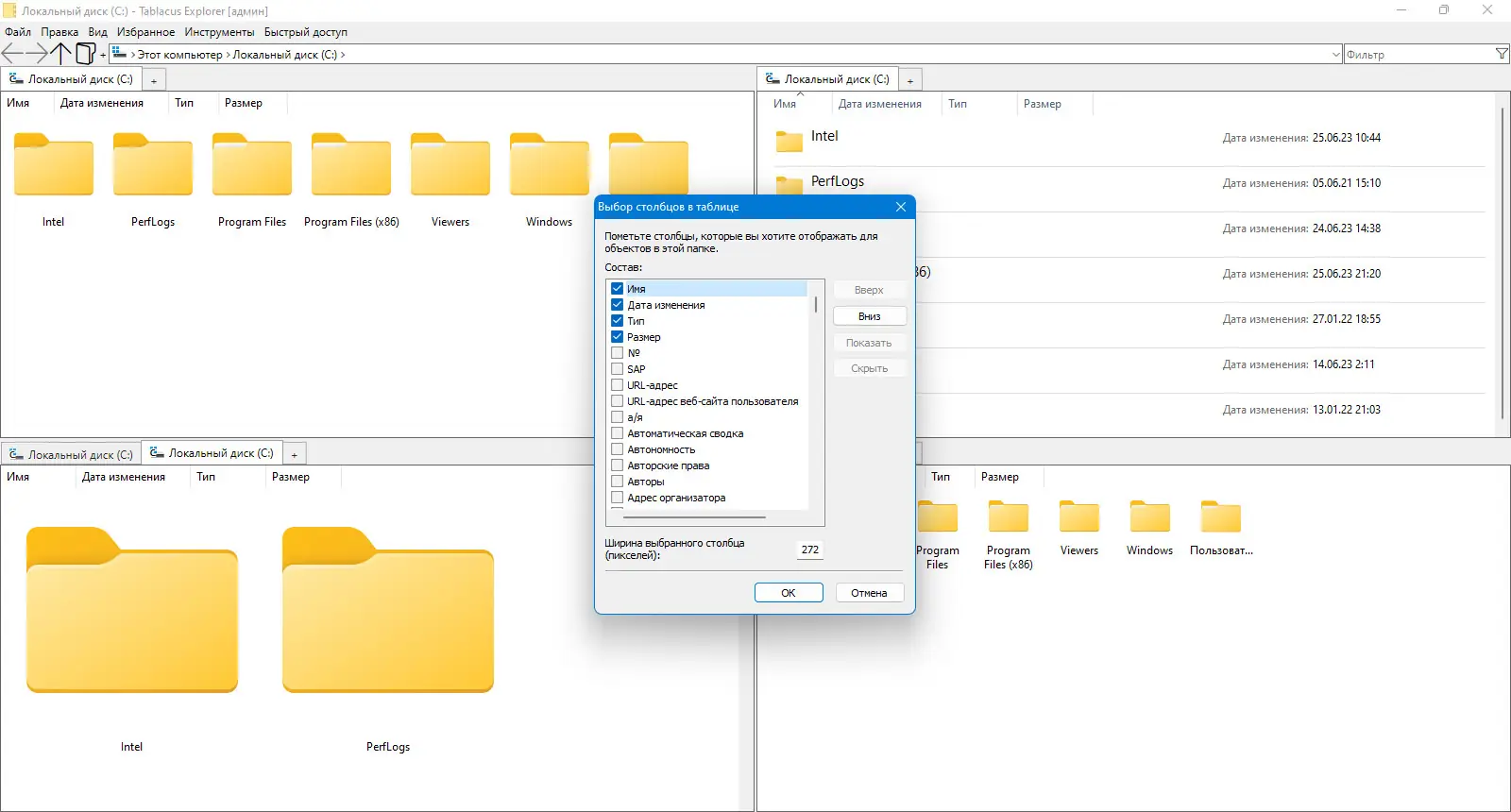Tablacus Explorer представляет собой альтернативу стандартному проводнику Windows, ориентированную на повышение производительности и удобства при работе с файлами. Программа поддерживает двух- и четырёхпанельный режимы отображения, а также позволяет открывать неограниченное количество вкладок для быстрой навигации между каталогами. Интерфейс приложения интуитивно понятен и напоминает классический проводник, что упрощает переход для пользователей, не желающих осваивать сложные двухпанельные аналоги. При этом функционал значительно расширен за счёт встроенной поддержки плагинов и настраиваемых профилей.