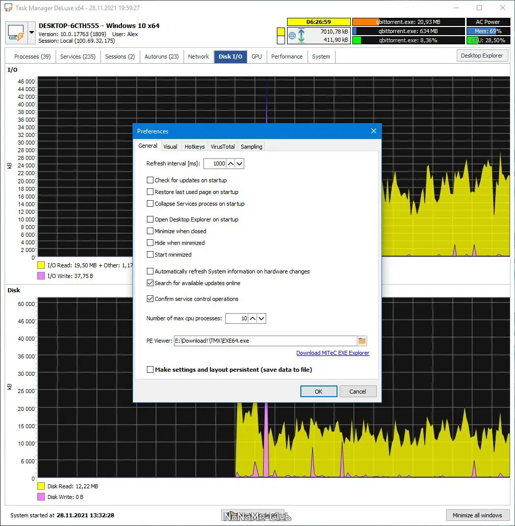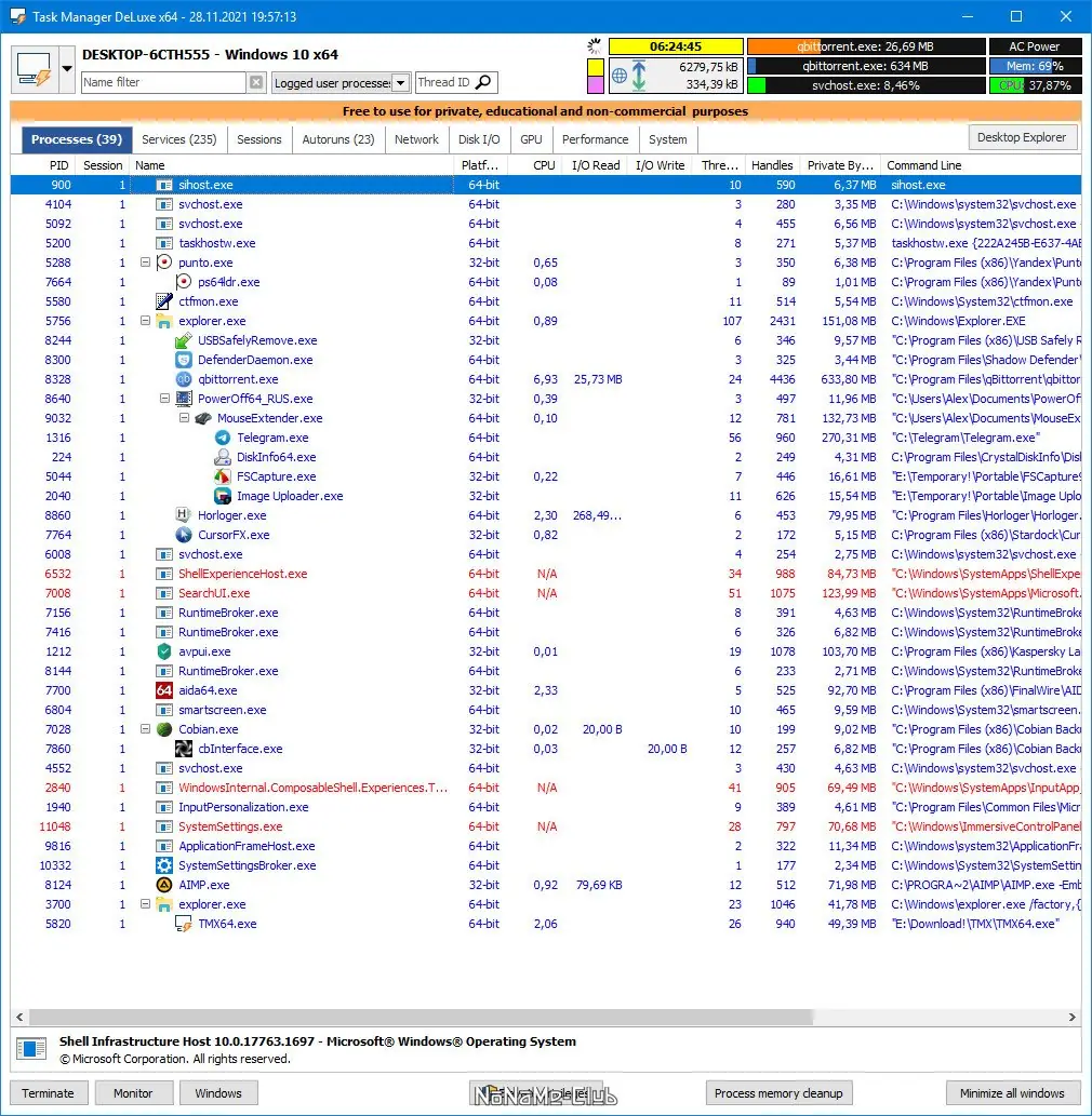Task Manager DeLuxe — это расширенная утилита для мониторинга и управления системными процессами, службами, сетевыми подключениями и сеансами пользователей, работающая без установки и не оставляющая следов в реестре. Программа предоставляет детальную информацию о состоянии операционной системы, включая производительность оборудования, автозагрузку и активность на терминальных серверах. Поддержка автоматического обновления данных и журналирования сеансов делает её незаменимой для диагностики и администрирования Windows-сред.
