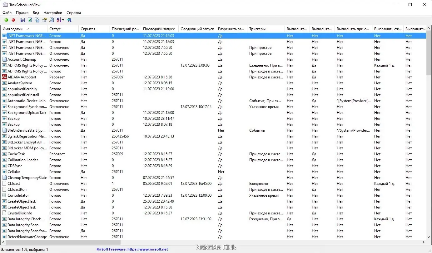 TaskSchedulerView предоставляет полный доступ к системному планировщику задач без необходимости входа в стандартный интерфейс Windows. Утилита отображает каждую задачу с детализацией по ключевым параметрам: имя, состояние выполнения, скрытый или видимый статус, даты запусков, триггеры активации и путь к папке. Это позволяет быстро анализировать активность системы и выявлять ненужные или потенциально вредоносные процессы.