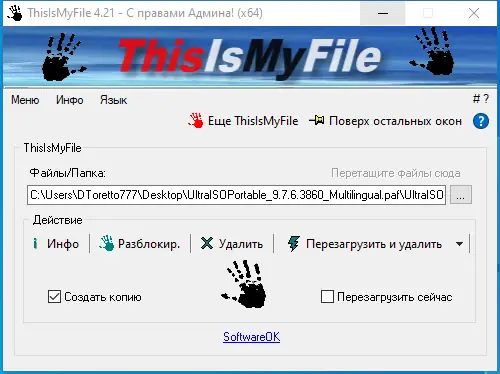 ThisIsMyFile — утилита для разблокировки и удаления стойких файлов и папок, которые не поддаются стандартным методам. Программа работает без установки, поддерживает создание резервных копий и принудительное удаление при перезагрузке системы. Простой интерфейс и поддержка перетаскивания объектов делают процесс интуитивно понятным.