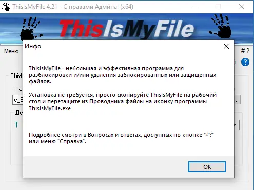 ThisIsMyFile предназначена для решения одной из самых раздражающих проблем в работе с операционной системой — невозможности удалить файл из-за блокировки со стороны процесса или защиты прав доступа. Утилита позволяет не только разблокировать такие элементы, но и удалить их даже в тех случаях, когда стандартные средства Windows оказываются бессильны. Это особенно актуально при работе с системными файлами, остатками деинсталлированных программ или повреждёнными объектами.