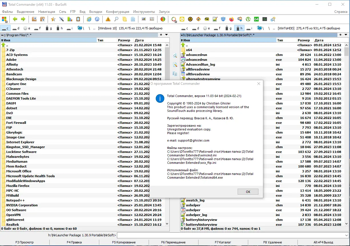 Запуск осуществляется напрямую из папки, без необходимости установки. Рекомендуется использовать права администратора и временно отключить UAC для корректной работы всех компонентов. Интерфейс разделён на две панели, что упрощает операции переноса, копирования и синхронизации данных. Через меню «Файлы — Внутренние ассоциации» можно настроить, какие программы будут открывать определённые типы файлов. Для быстрого доступа к инструментам используется F4, вызывающая контекстное меню F4Menu, а также горячие клавиши для встроенных утилит. Пользователь может «зарегистрировать» TC, вписав своё имя в заголовок окна, что добавляет персональный штрих. Дополнительные функции активируются через плагины, например, Total7zip для архивации или TCMediaInfo для анализа мультимедийных файлов.