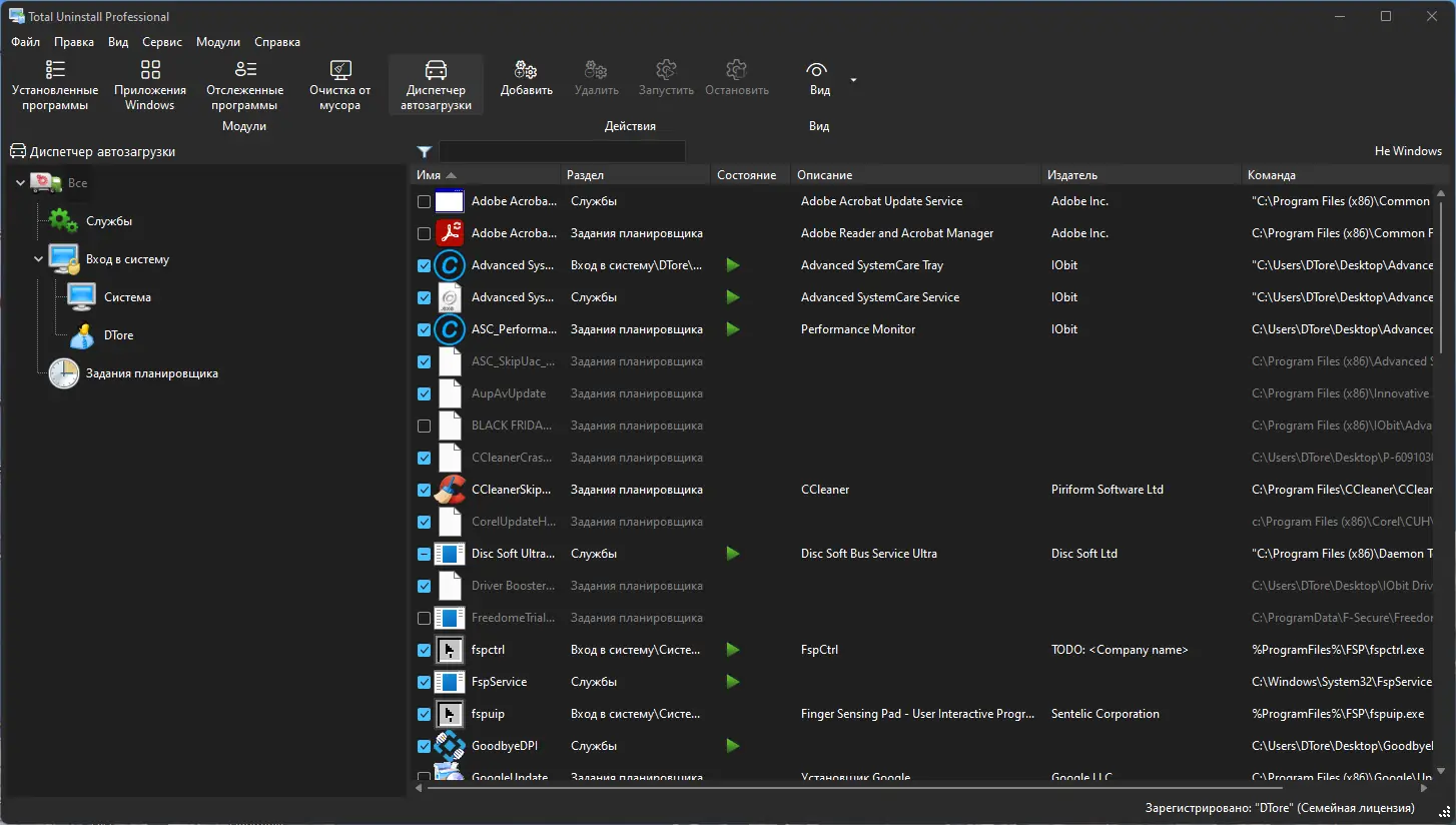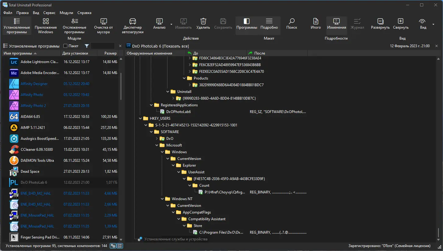 - Проводит глубокий анализ установленных приложений с фиксацией изменений в реестре