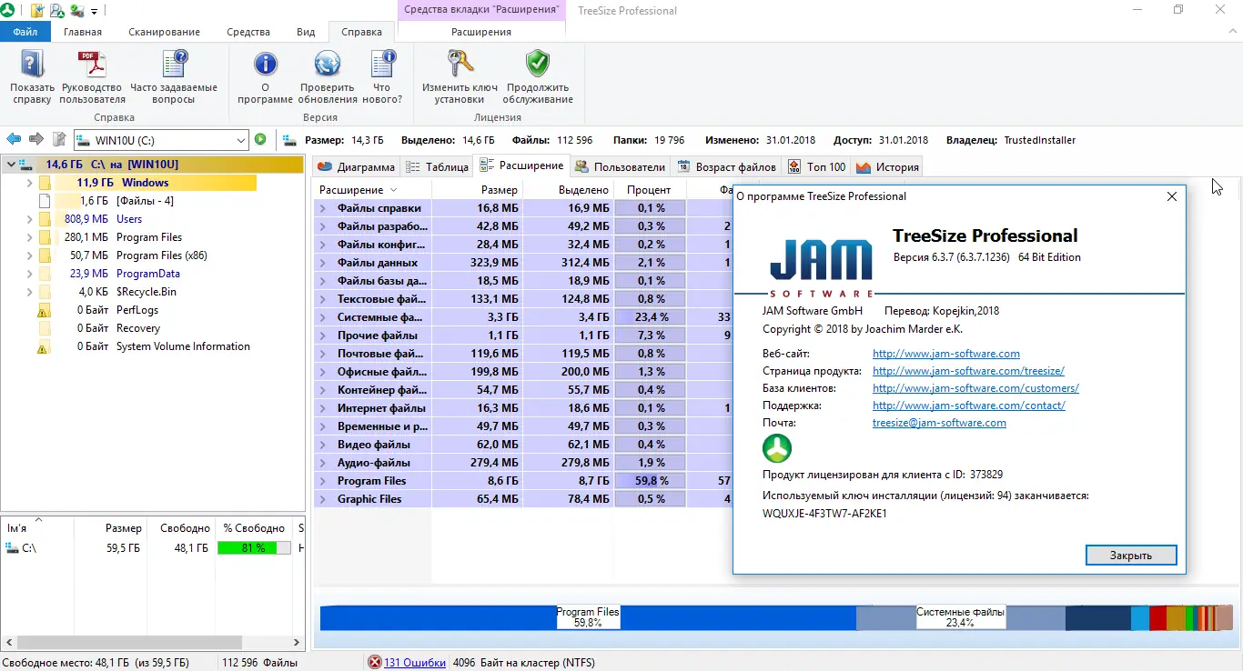 Программа сочетает в себе мощные аналитические функции и простоту в использовании, что делает её пригодной как для рядовых пользователей, так и для системных администраторов. TreeSize поддерживает работу с локальными и сетевыми дисками, включая подключение через UNC-пути. Несмотря на широкий функционал, интерфейс остаётся интуитивным, а производительность — высокой даже при анализе больших массивов данных. Однако, в бесплатной версии доступны не все возможности, а полная версия требует активации.