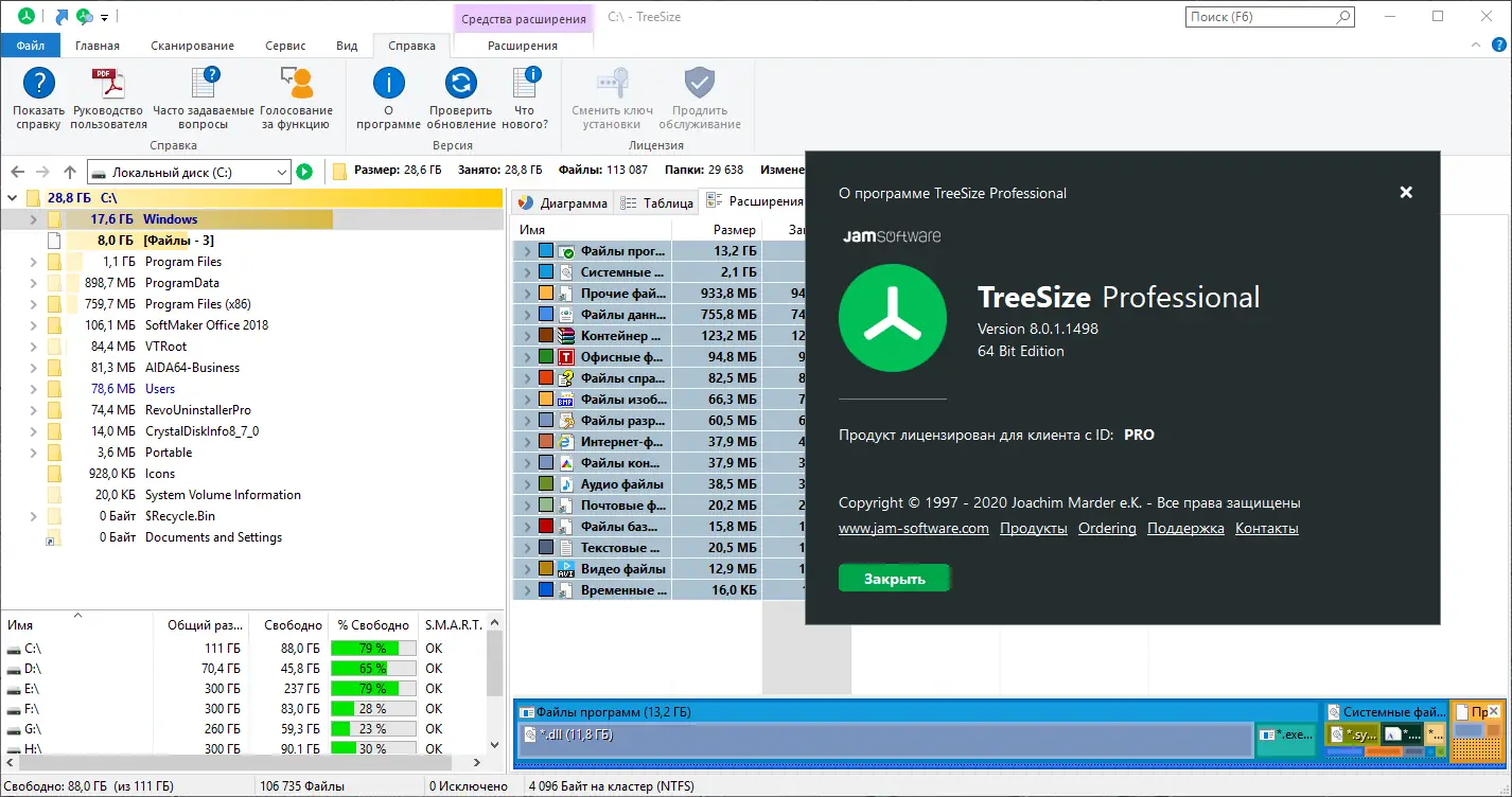 TreeSize Professional — это мощная утилита для анализа и управления дисковым пространством в операционных системах Windows. Программа позволяет быстро выявлять крупные и устаревшие файлы, визуализировать структуру папок и эффективно освобождать место на жёстких дисках. Поддержка сетевых ресурсов, детальная аналитика и гибкие возможности экспорта делают её незаменимой для системных администраторов и обычных пользователей.