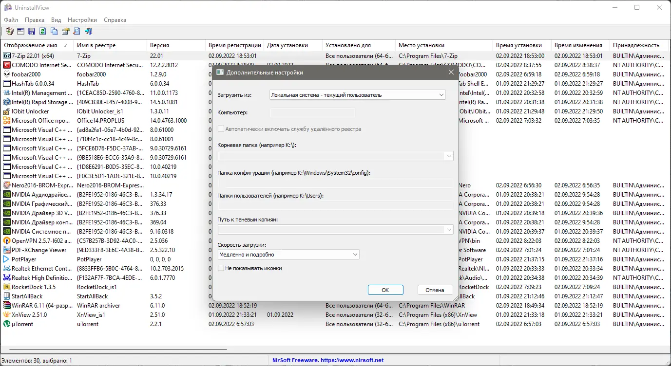 UninstallView — это компактная утилита для анализа и управления установленным программным обеспечением в системе Windows. Программа отображает полный список всех приложений, включая те, что скрыты из стандартного раздела «Удаление программ». Инструмент поддерживает работу с локальными, удаленными компьютерами и внешними дисками, обеспечивая удобное администрирование программной среды.