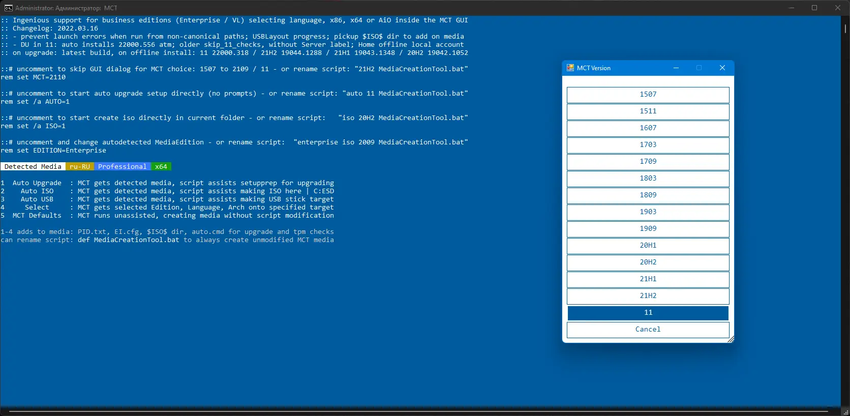 Для начала работы необходимо запустить файл MediaCreationTool.bat с правами администратора. После запуска появляется меню выбора: можно указать, какую версию ОС требуется установить — в данном случае это 11. Далее пользователь выбирает нужную опцию: Auto Upgrade для мгновенного обновления, Make ISO для формирования образа, Make USB для создания загрузочной флешки. Также доступен выбор редакции системы и языка интерфейса через опцию Select. Режим MCT Defaults подходит тем, кто хочет получить чистый установочный носитель без модификаций. После завершения подготовки можно приступать к установке на целевое устройство.