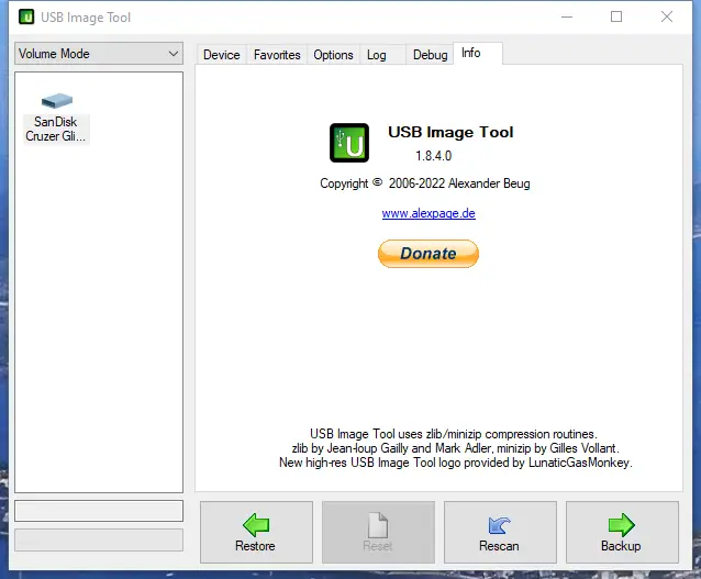 Интерфейс утилиты предельно прост и не перегружен лишними элементами. После подключения USB-устройства оно автоматически отображается в основном окне программы. Для создания образа достаточно выбрать устройство, указать путь сохранения и формат (IMG, IMA или IMZ), после чего запустить процесс копирования. Восстановление выполняется в обратном порядке — выбирается образ, подключается целевой накопитель, и запускается запись. Функция Reset позволяет вернуть флешку к исходному состоянию, особенно полезно при некорректном отображении ёмкости в системе. Портативная версия работает без установки, что удобно для использования с любого компьютера.