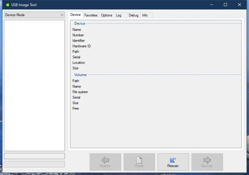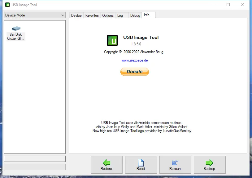Интерфейс утилиты минималистичен и интуитивно понятен. После подключения USB-устройства оно автоматически отображается в окне программы, где можно увидеть объём, букву диска и прочую служебную информацию. Для создания образа достаточно выбрать устройство, нажать кнопку «Create» и указать путь для сохранения файла. Процесс копирования проходит быстро за счёт прямого доступа к секторам, минуя файловую систему. Восстановление выполняется аналогично — выбирается образ, затем целевое устройство, после чего данные записываются с полным перезаписыванием содержимого. Также доступна функция сброса — Reset, которая может помочь вернуть полный объём флешки, если часть памяти стала недоступной в системе.