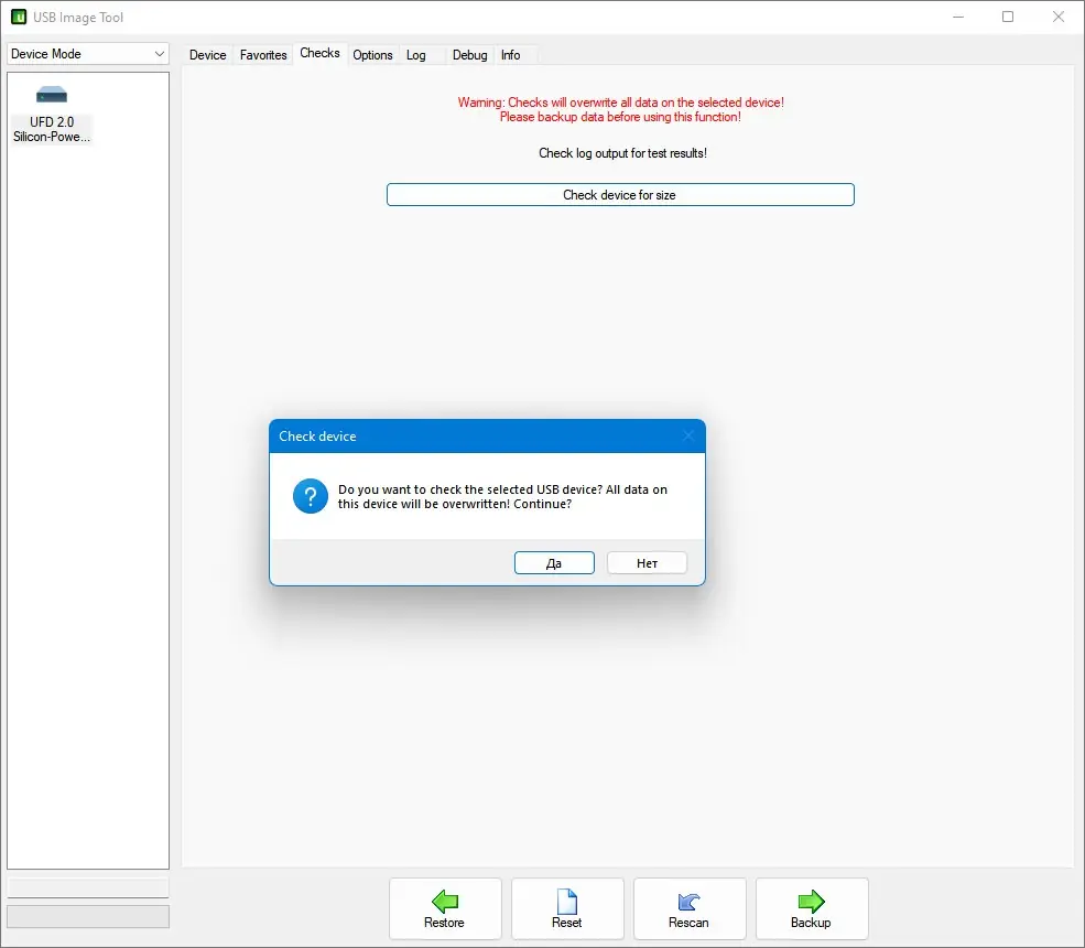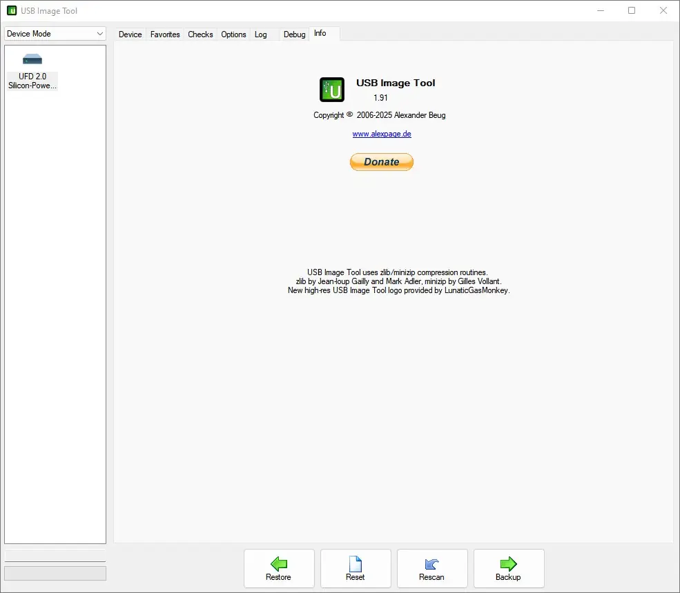 Интерфейс утилиты минималистичен и интуитивно понятен. После подключения USB-устройства оно отображается в основном окне, где доступна информация о объёме, занятом и свободном пространстве. Для создания образа достаточно выбрать устройство, нажать кнопку «Create» и указать путь для сохранения файла. Процесс копирования проходит быстро благодаря прямому доступу к секторам. Восстановление выполняется аналогично — через кнопку «Restore» с выбором нужного образа. Также доступна функция Reset, которая помогает вернуть флешку к исходному состоянию, особенно если система не распознаёт полный объём памяти. Поддержка командной строки позволяет интегрировать утилиту в скрипты и автоматизированные процессы резервного копирования.