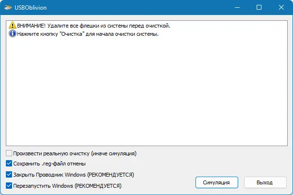 USB Oblivion — портативная утилита для очистки реестра Windows от записей о подключённых USB-устройствах, включая флеш-накопители, внешние диски и виртуальные CD-ROM. Программа поддерживает работу с системами от Windows XP до Windows 11, обеспечивая конфиденциальность и чистоту системного реестра. Работает в тестовом и автоматическом режимах, позволяет создавать резервные копии изменений.