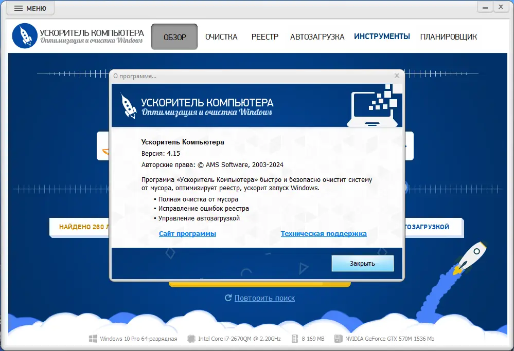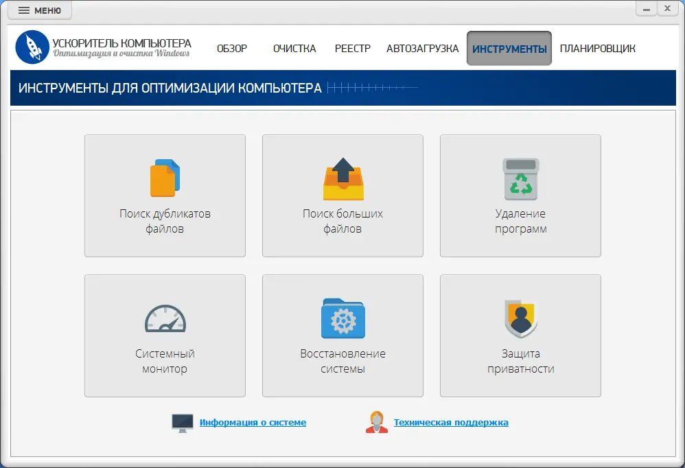 Ускоритель Компьютера — это мощная утилита для очистки системы, оптимизации реестра и управления автозагрузкой программ. Программа помогает избавиться от временных файлов, мусора и ошибок реестра, освобождая место на диске и повышая общую производительность ПК. Благодаря интуитивному интерфейсу и автоматическим функциям, она подходит как новичкам, так и опытным пользователям.