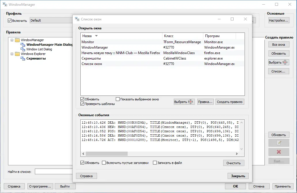 - Гибкая система правил, позволяющая задавать поведение для конкретных окон.