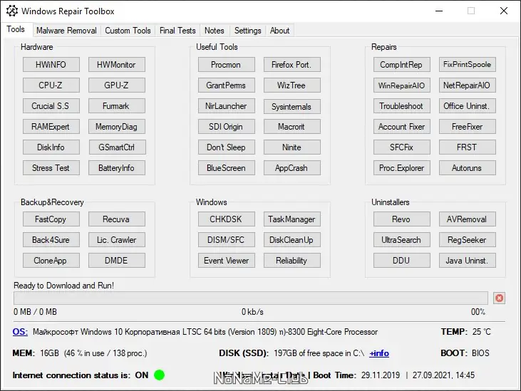 Repair Toolbox — это графическая оболочка, объединяющая множество бесплатных инструментов для диагностики и восстановления операционной системы. Программа позволяет быстро находить и устранять системные сбои, управлять автозагрузкой, создавать резервные копии и работать с вредоносным ПО. Интерфейс организован по категориям, что упрощает доступ к нужным утилитам без лишних усилий.