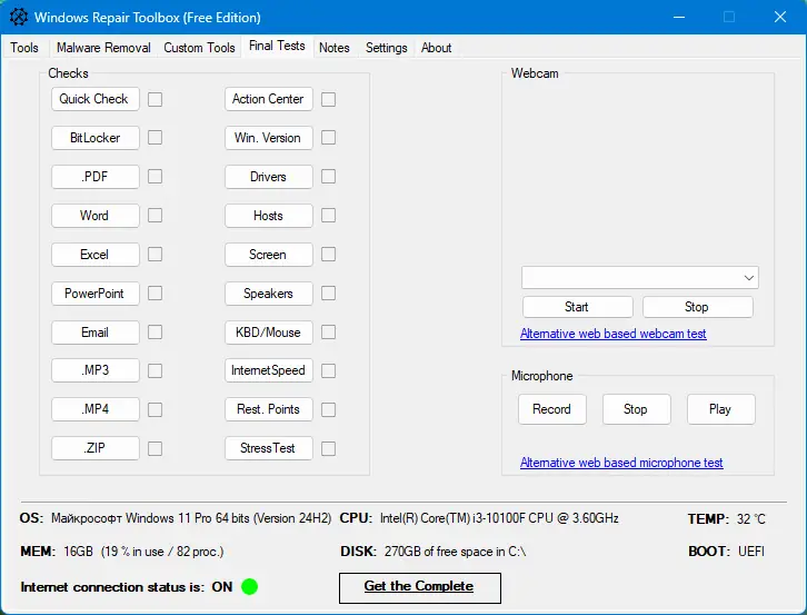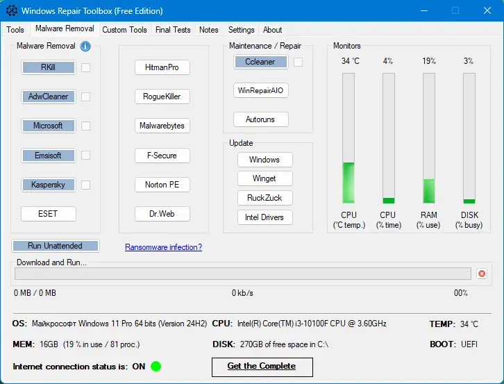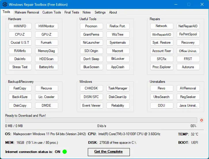Repair Toolbox представляет собой агрегатор эффективных инструментов, предназначенных для комплексного обслуживания операционной системы. Вместо поиска и установки отдельных утилит вручную, пользователь получает централизованный доступ к проверенным решениям, которые автоматически подбираются под разрядность и версию windows. Это существенно ускоряет процесс диагностики и устранения системных сбоев, особенно при работе с заражёнными или нестабильными конфигурациями. Программа поддерживает как стационарные, так и портативные версии, что делает её универсальным решением для администраторов и домашних пользователей.