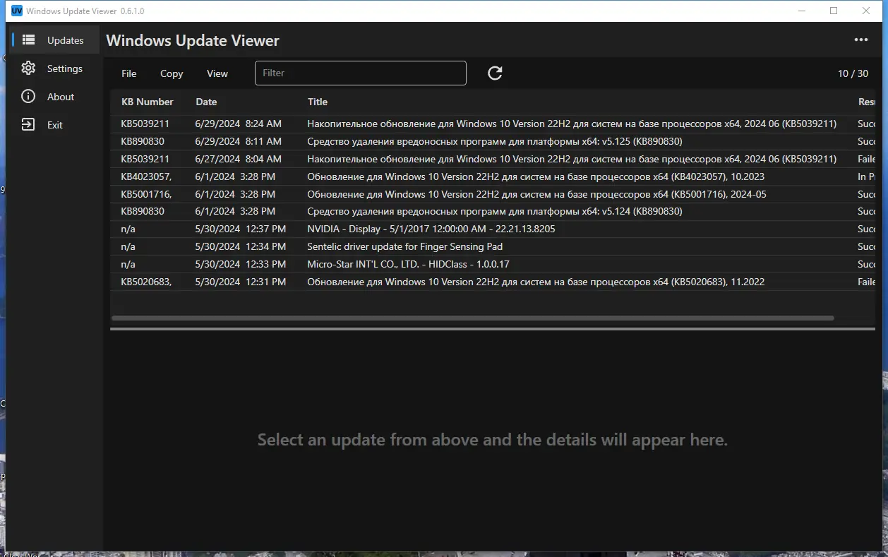 Update Viewer — это инструмент для просмотра информации об установленных обновлениях Windows, использующий внутренние API и системные журналы событий. Программа помогает пользователям получить детальные сведения о каждом обновлении, включая номер базы знаний, дату установки и статус. Интерфейс прост и ориентирован на быстрый доступ к нужным данным без лишних действий.