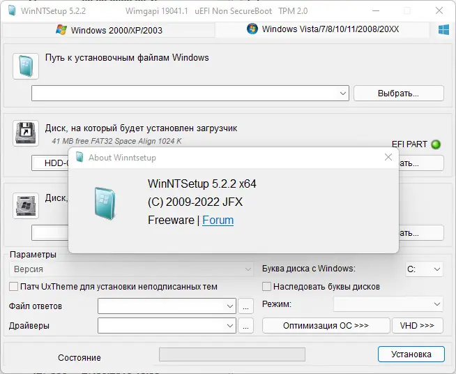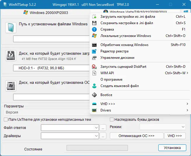 WinNTSetup — это утилита, предназначенная для гибкой установки операционных систем Windows на различные типы носителей. Программа позволяет быстро развернуть систему с образа, не прибегая к стандартному установщику. что это за программа — становится понятно уже при первом запуске, когда перед пользователем открывается простой и функциональный интерфейс.