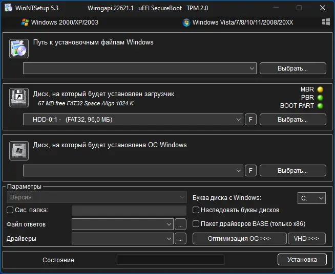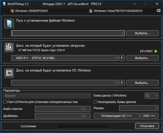 WinNTSetup — это компактная и мощная утилита для установки операционной системы Windows на жёсткий диск, виртуальный накопитель или флешку без использования стандартного установочного носителя. Программа поддерживает широкий спектр версий Windows и предоставляет расширенные настройки на этапе развёртывания образа. что это за программа — станет понятно уже на первом этапе использования.