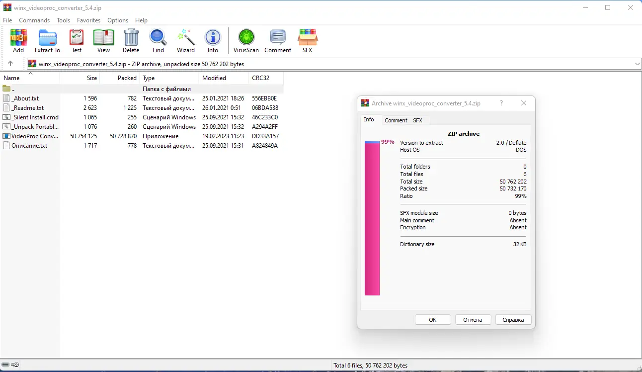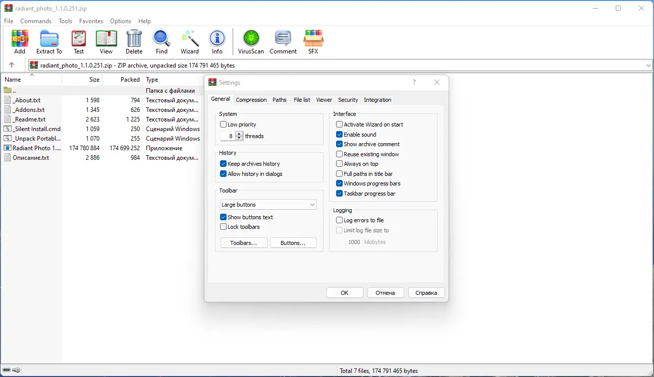 - Поддержка шифрования и создания самораспаковывающихся архивов