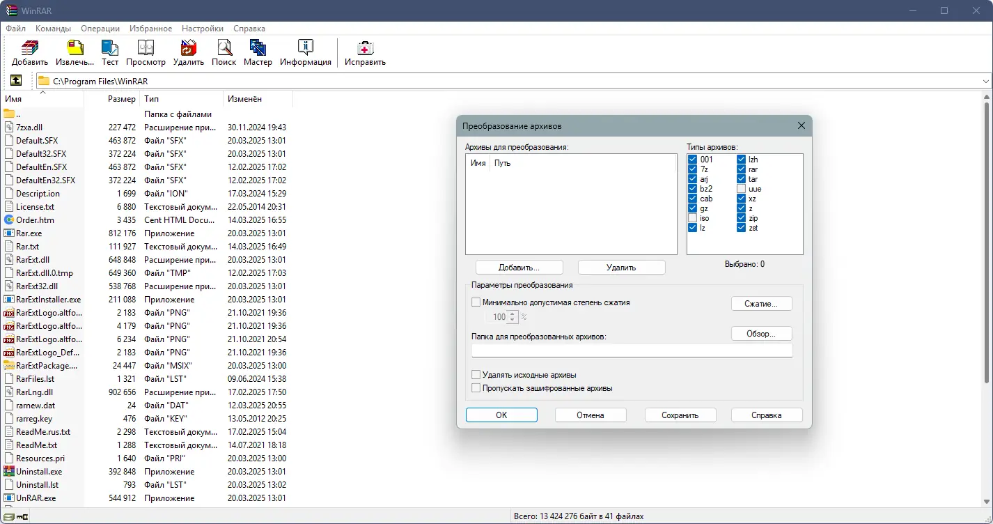 - Поддержка форматов RAR, ZIP, 7Z, CAB, ARJ и других, включая редкие архивные типы