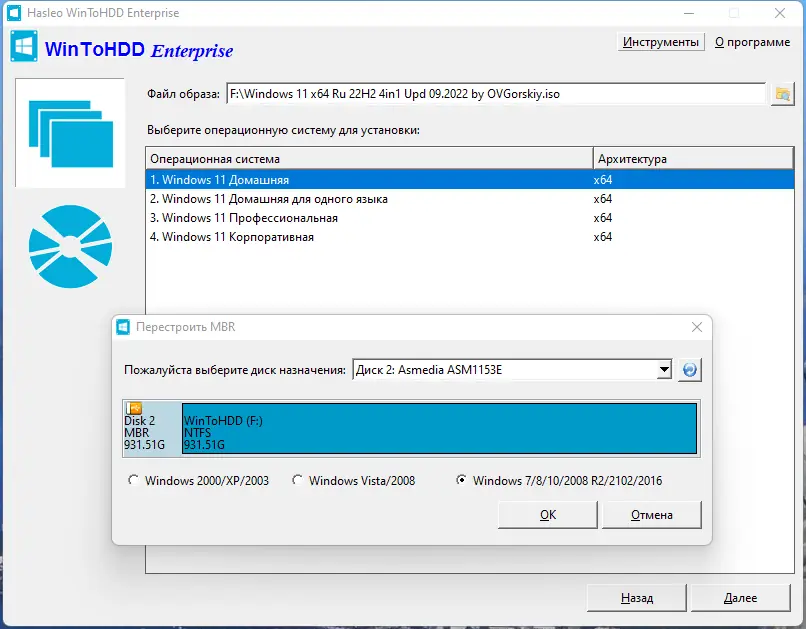WinToHDD — это мощная утилита для установки, переустановки и клонирования операционных систем Windows без использования внешних носителей. Программа работает напрямую с ISO-образами и позволяет развернуть систему на любом доступном диске, подключённом к компьютеру. Поддерживается работа с Windows 11, 10, 8.1, 8 и 7 как в 32-, так и в 64-битных версиях.