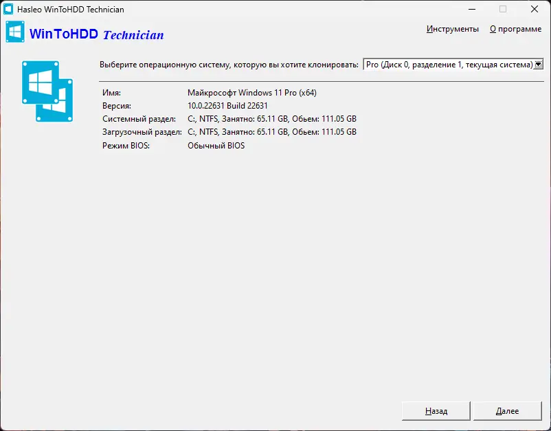 - Клонирование текущей Windows на другой диск с сохранением всех настроек