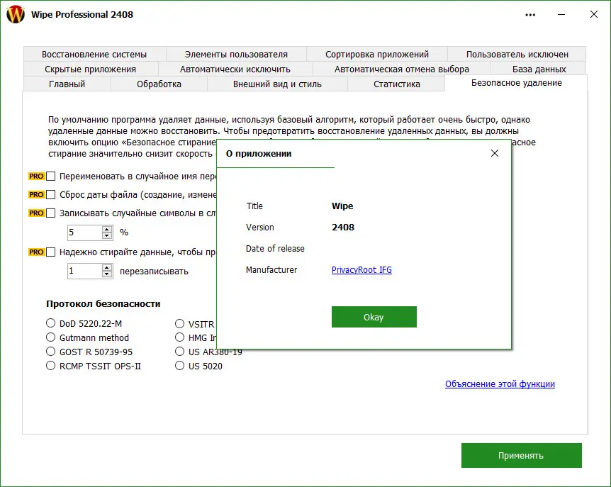 - Поддержка методов безопасного удаления: DOD 5220.22, Guttman и ГОСТ Р50739-95
