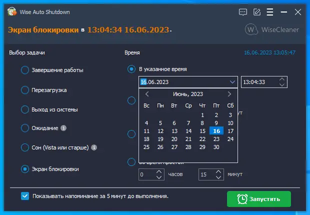 Интерфейс Wise Auto Shutdown интуитивно понятен и не требует глубоких технических знаний. После запуска приложения пользователь выбирает нужное действие: выключить, перезагрузить, заснуть или выйти из учётной записи. Далее указывается время — можно задать конкретный момент, отсчёт от текущего времени или ежедневное повторение. При необходимости включается напоминание, которое появится за несколько минут до выполнения. После настройки задача сохраняется, а программа продолжает работать в трее, ожидая наступления запланированного времени. Для отмены или изменения задачи достаточно открыть интерфейс и внести корректировки.