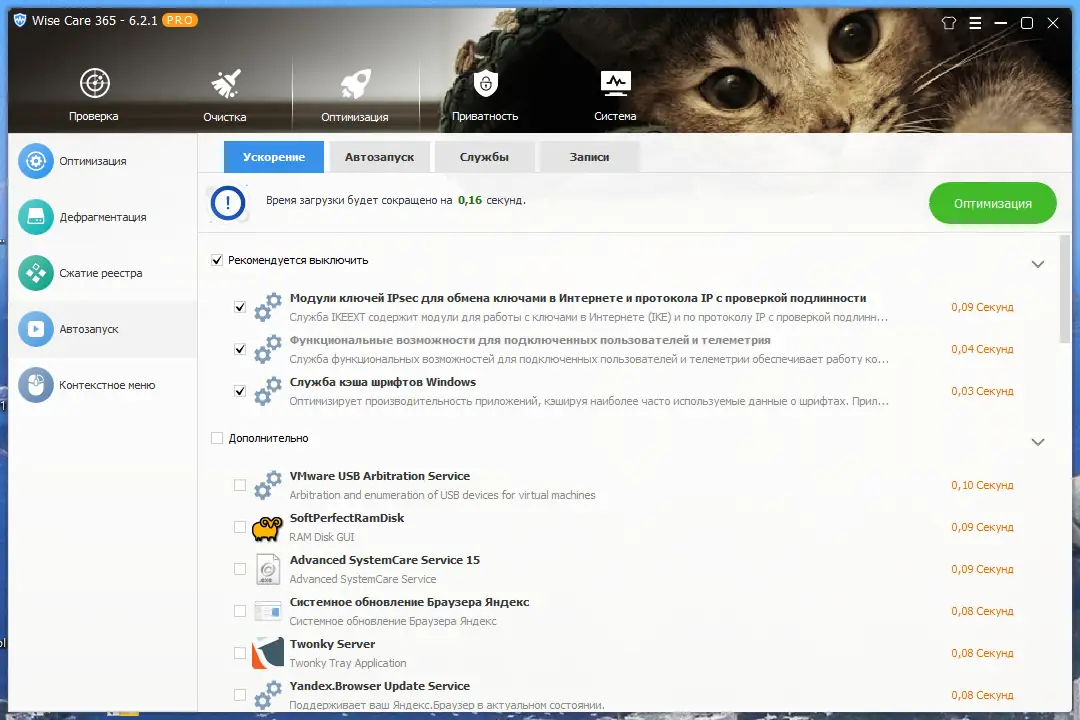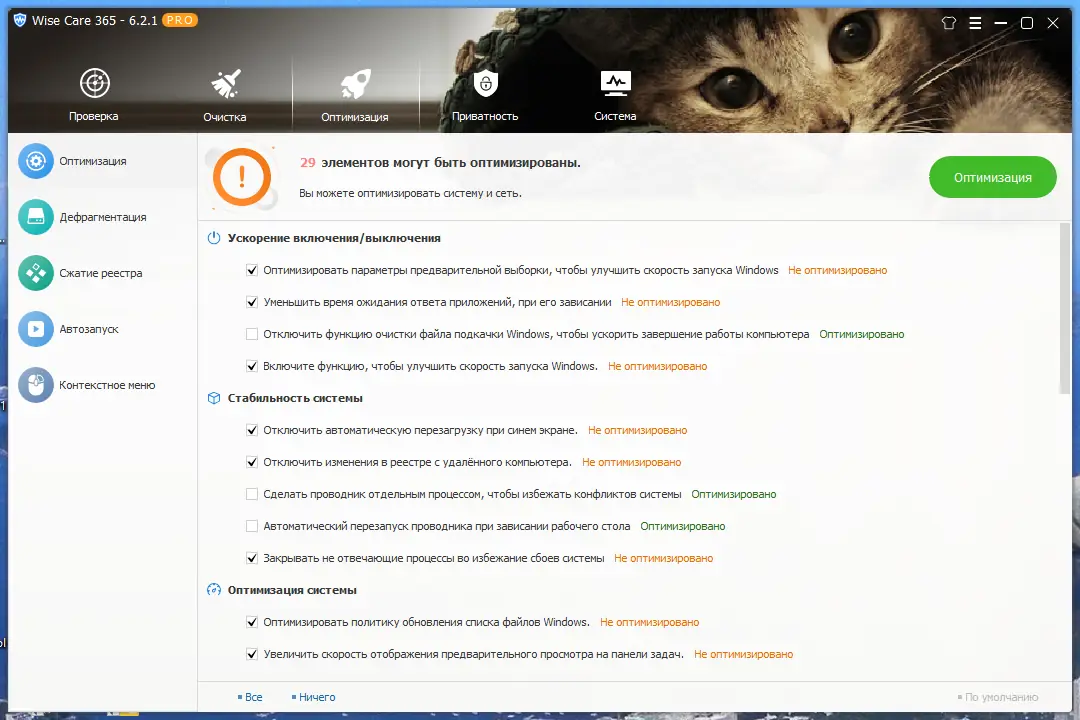 - Оптимизация реестра и системы в один клик