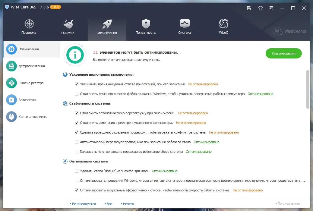 Программа предлагает режим «Оптимизация в один клик», который за несколько секунд анализирует систему и устраняет основные проблемы производительности.
