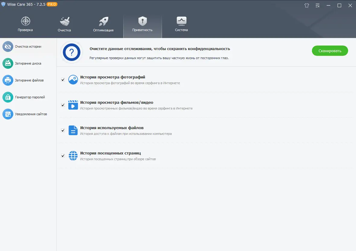 - Обеспечивает защиту личных данных, стирая следы активности в браузерах, журналах программ и временных папках.