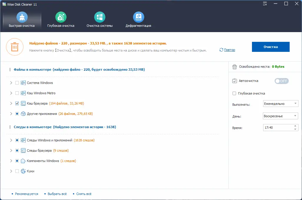 Использование Wise Disk Cleaner не требует специальных знаний. После запуска приложения нужно выбрать тип сканирования — базовый или расширенный — и указать диски, которые необходимо проверить. По завершении анализа откроется список всех обнаруженных временных и ненужных файлов, сгруппированных по категориям. Пользователь может детально изучить каждый элемент, отметить галочками те, что подлежат удалению, и запустить процесс очистки одним кликом. Также доступна опция автоматической очистки по расписанию, что позволяет поддерживать систему в порядке без постоянного вмешательства.