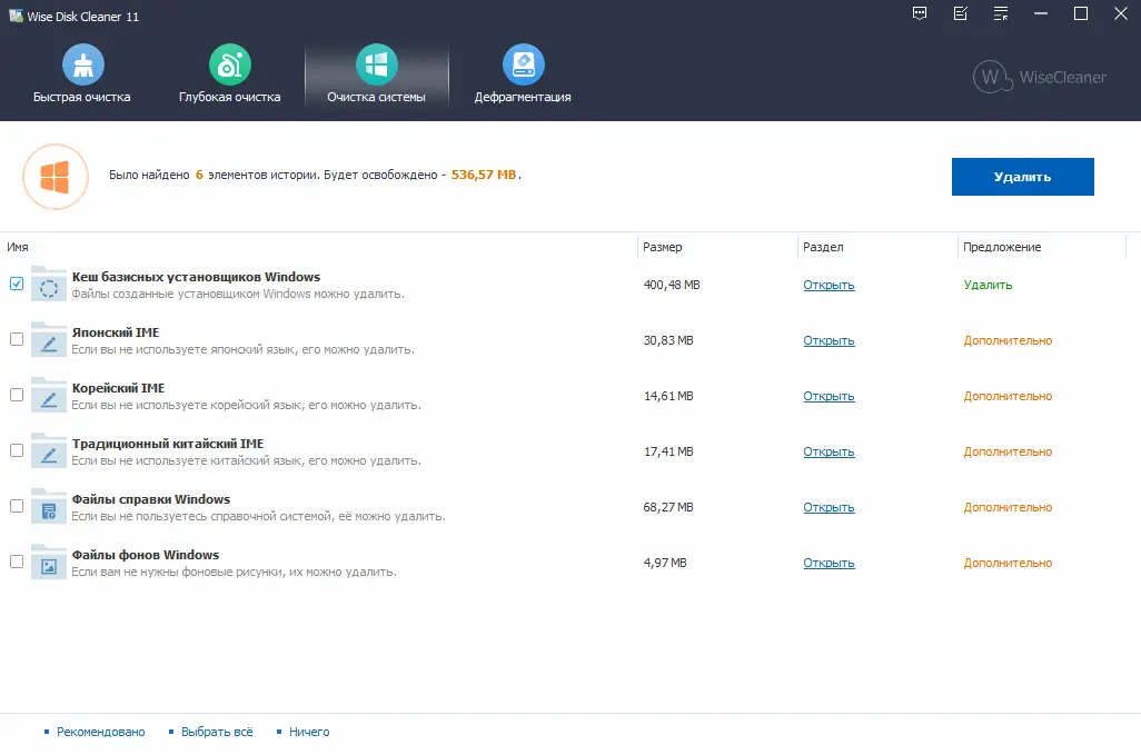 Wise Disk Cleaner — это надежная утилита для очистки жестких дисков от временных, ненужных и устаревших файлов, способствующая ускорению работы системы и освобождению дискового пространства. Программа эффективно анализирует накопители, выявляя более 50 типов мусорных данных, включая кэш, логи, временные файлы установщиков и остатки удалённых приложений. Интуитивно понятный интерфейс позволяет быстро освоить функционал даже новичку.
