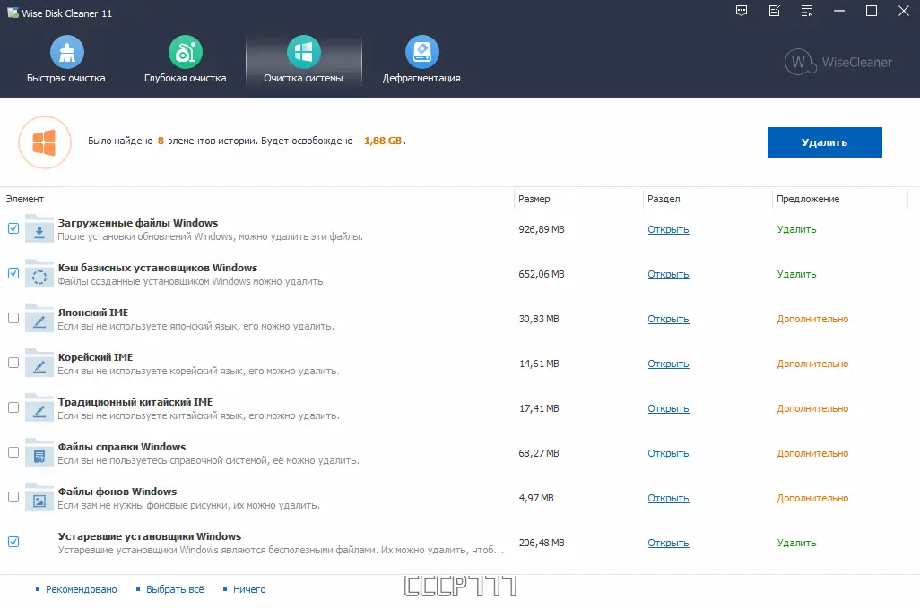 - Высокая скорость сканирования и точность определения мусорных файлов