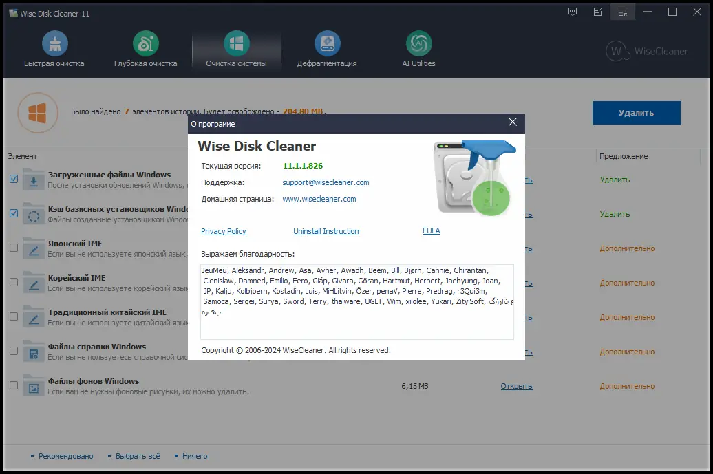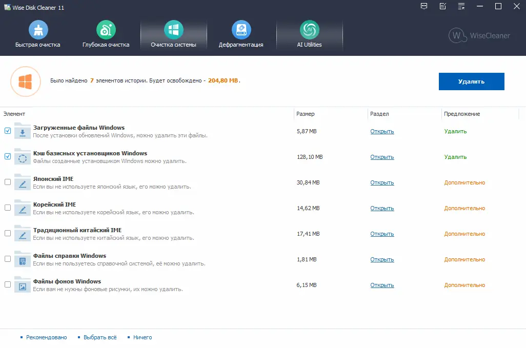 Wise Disk Cleaner — это надежная утилита для глубокой очистки жестких дисков от временных, кэшированных и ненужных файлов, способствующая ускорению работы системы и освобождению дискового пространства. Программа поддерживает обнаружение более чем 50 типов мусорных данных и позволяет пользователю самостоятельно выбирать, какие файлы удалять. Работа осуществляется быстро, безопасно и с минимальным участием пользователя.