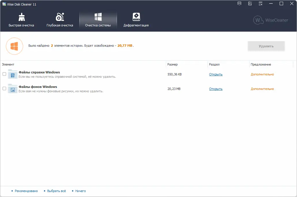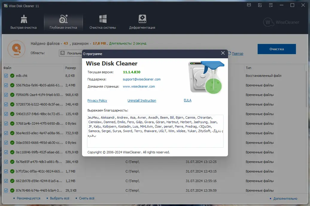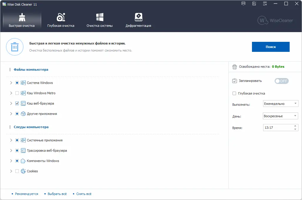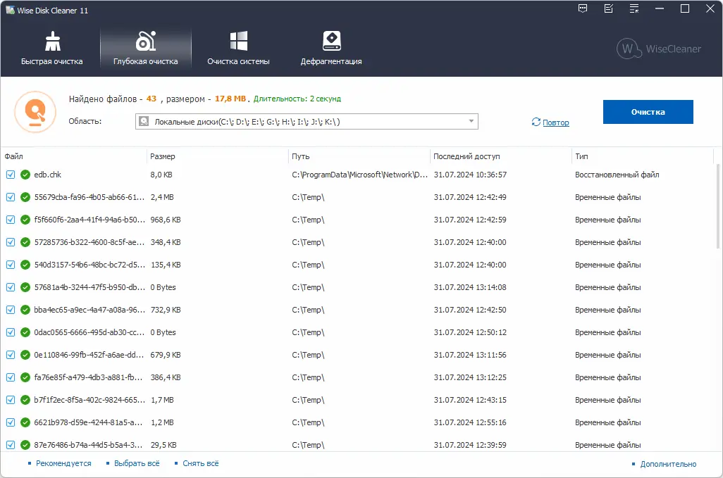 Wise Disk Cleaner — это эффективная утилита для очистки дисков от временных, кэшированных и ненужных файлов, способная ускорить работу системы и освободить значительное количество места на жёстком диске. Программа поддерживает более 50 форматов мусорных файлов и позволяет вручную добавлять новые типы для сканирования. Простой интерфейс и высокая скорость обработки делают её удобным инструментом для повседневного обслуживания компьютера.