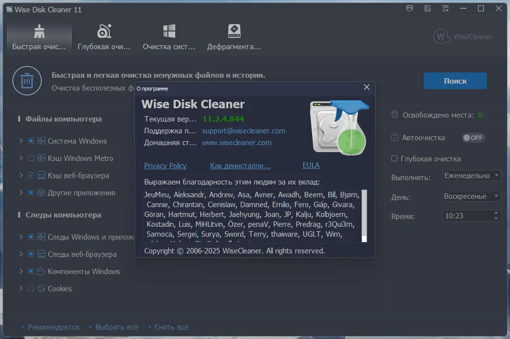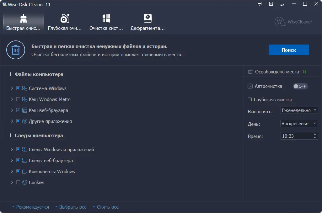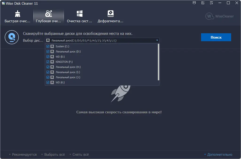 Wise Disk Cleaner — это эффективная утилита для очистки жестких дисков от временных, ненужных и мусорных файлов, способная ускорить работу системы и освободить дисковое пространство. Программа поддерживает более 50 форматов файлов-«мусорников» и позволяет добавлять пользовательские типы. Процесс сканирования быстрый, а интерфейс интуитивно понятен даже новичкам.