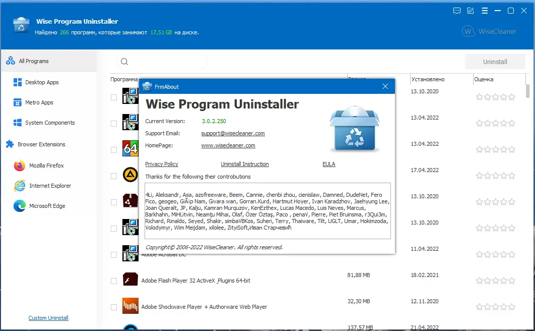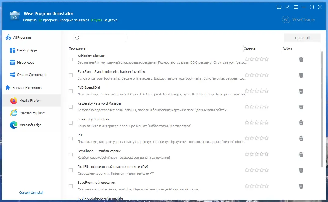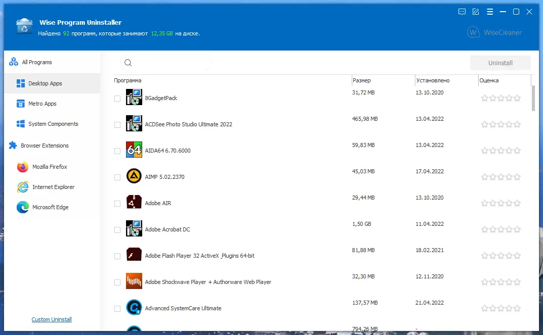 Wise Program Uninstaller — это инструмент для полного и безопасного удаления программ с компьютера. Приложение сочетает в себе стандартные методы деинсталляции и собственные алгоритмы очистки, обеспечивая удаление не только основных компонентов, но и остаточных файлов, папок и записей реестра. Подходит для пользователей, стремящихся поддерживать систему в чистоте и оптимизировать её производительность.