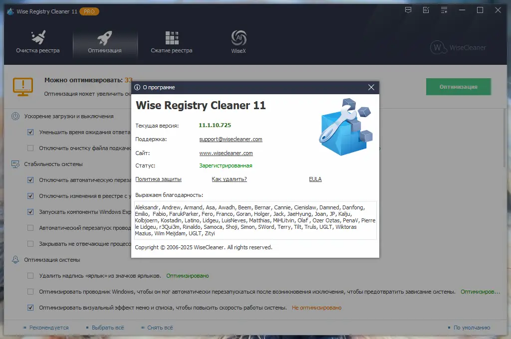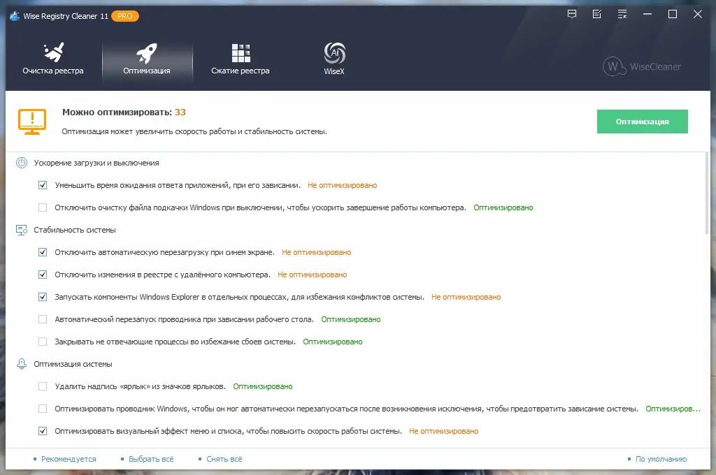 - Wise Registry Cleaner оптимизирует параметры запуска системы, ускоряет работу интернета и увеличивает стабильность работы Windows.