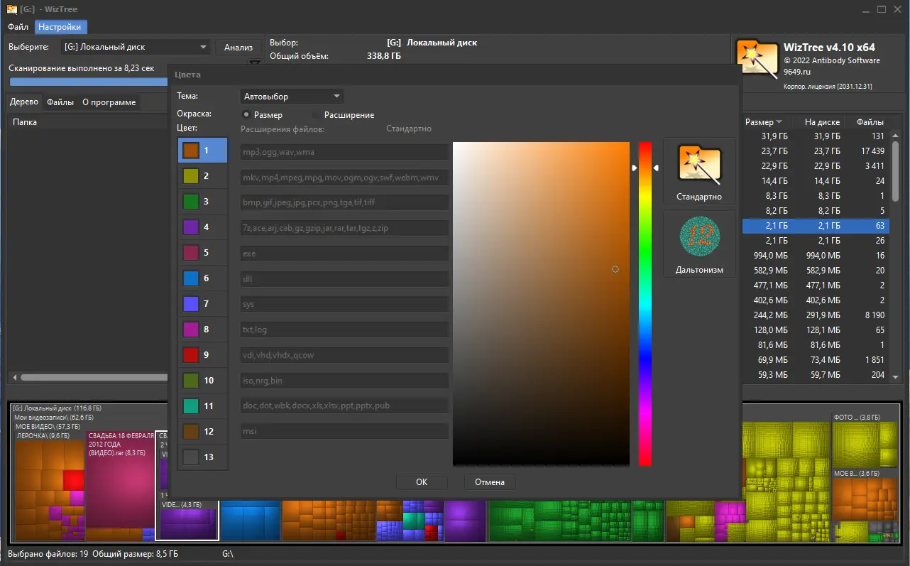- Программа отображает распределение данных в виде цветной карты-древа, где размер и цвет сегментов отражают объём занимаемого места.