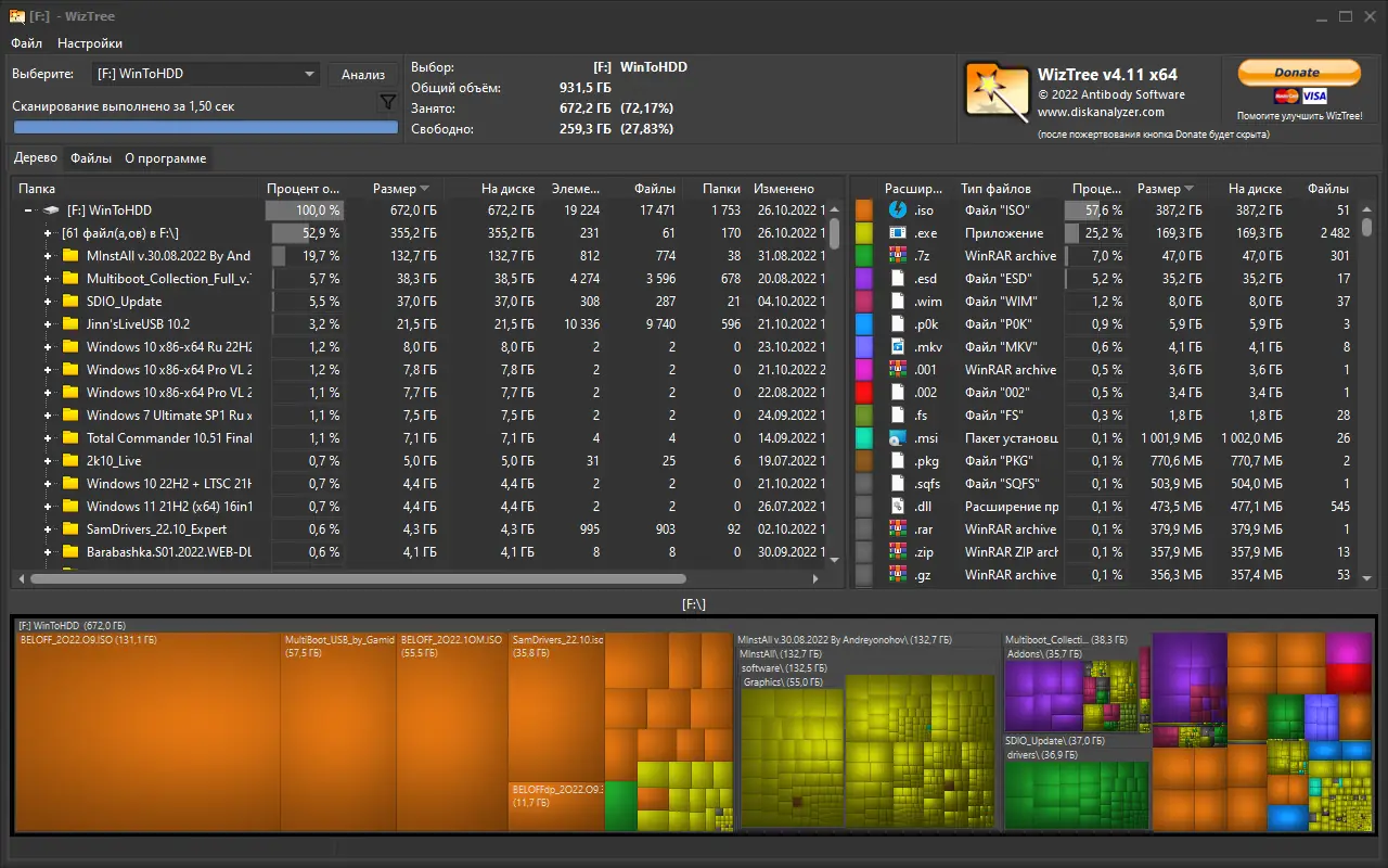 WizTree — это высокоскоростная утилита для анализа дискового пространства, которая помогает быстро выявить файлы и папки, занимающие наибольший объем на жестком диске. Программа работает напрямую с файловой таблицей NTFS, что обеспечивает мгновенное сканирование даже самых объемных накопителей. Ее интуитивный интерфейс и визуальные инструменты делают процесс оптимизации хранилища простым и эффективным.
