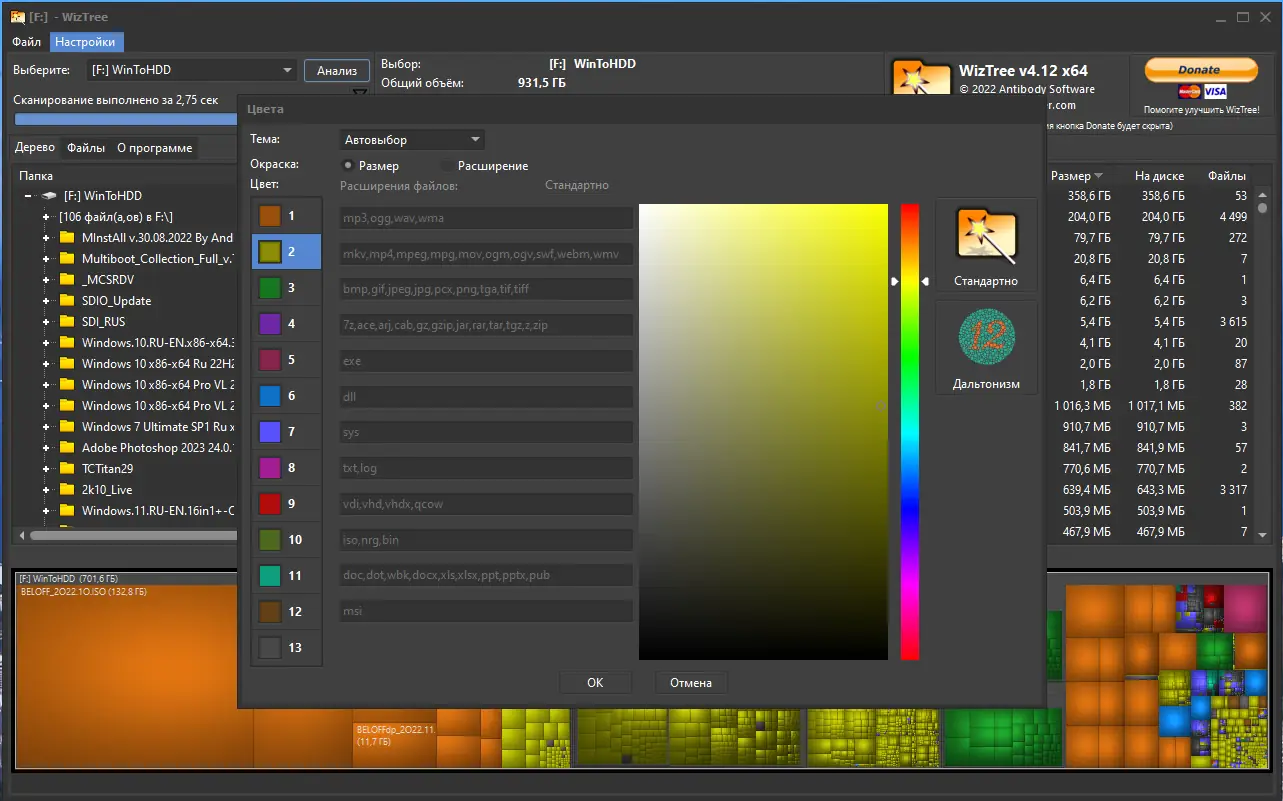 WizTree — это высокоскоростная утилита для анализа дискового пространства, которая помогает быстро выявить файлы и папки, занимающие наибольший объём на жёстком диске. Программа работает напрямую с файловой таблицей NTFS, что обеспечивает молниеносное сканирование даже самых больших накопителей. Интерфейс интуитивно понятен, а визуализация данных позволяет эффективно управлять хранением информации.